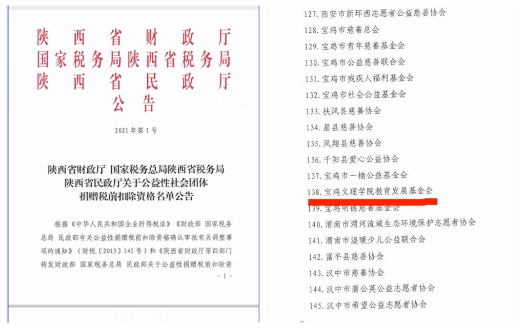 根据《陕西省财政厅、国家税务总局陕西省税务局、陕西省民政厅关于公益性社会团体捐赠税前扣除资格名单公告》,beat365英国官方网站教育发展基金会获得公益性社会团体捐赠税前扣除资格。获此资格,意味着向beat365教育发展基金会捐赠的企业和个人可依法享受国家税前扣除的税收优惠政策。