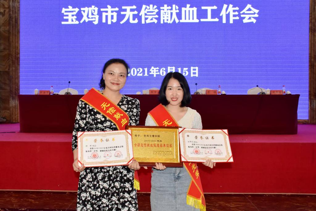 6月15日下午,在第18个世界献血者日到来之际,宝鸡市献血领导小组召开全市无偿献血工作会,对2018-2019年度获奖代表进行表彰。beat365被国家卫生健康委员会、中国红十字会总会、中央军委后勤保障部卫生局先后授予“2018-2019年度全国无偿献血促进奖单位奖”“宝鸡市无偿献血先进单位”,数学与信息科学学院青年志愿者协会负责人高梦霞荣获“全国无偿献血志愿服务奖一星奖”,校团委副书记赵昕荣获“全国无偿献血志愿服务奖二星奖”并作会议交流发言。