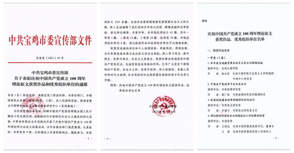 为庆祝党的百年华诞,回顾中国共产党团结带领全国人民不懈奋斗的光辉历程,讴歌新时代中国特色社会主义建设的伟大成就,中共宝鸡市委宣传部在全市范围内开展了庆祝中国共产党成立100周年理论研讨会论文征集活动。马克思主义学院教师、陕西省重点中国特色社会主义理论体系研究中心(宝鸡基地)骨干研究员张全省教授的理论文章《百年来宝鸡教育事业的巨大变迁与辉煌成就》荣获理论征文一等奖。