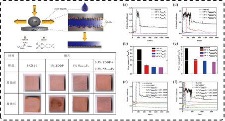 论文考察了PAO 10添加剂的摩擦学性能,并与ZDDP复配后研究复合体系的减摩抗磨特性和极压与防腐性能,为发展ZDDP的替代添加剂研究提供新思路。对于添加离子液体的混合体系,离子液体中含磷官能团的阳离子和阴离子将通过分子间的库仑力和相互作用力等吸附到摩擦副表面,而这些极性官能团可以和金属基底表面发生物理与化学的相互作用形成稳定的摩擦化学反应膜。分子的另一端是由油溶性的烷基链构成。阴阳离子中的烷基链通过彼此间侧向力的相互作用使形成的润滑膜更加致密有序。(科研管理处、机械工程学院 文/陈国庆 审核/凡明锦、王肖烨)