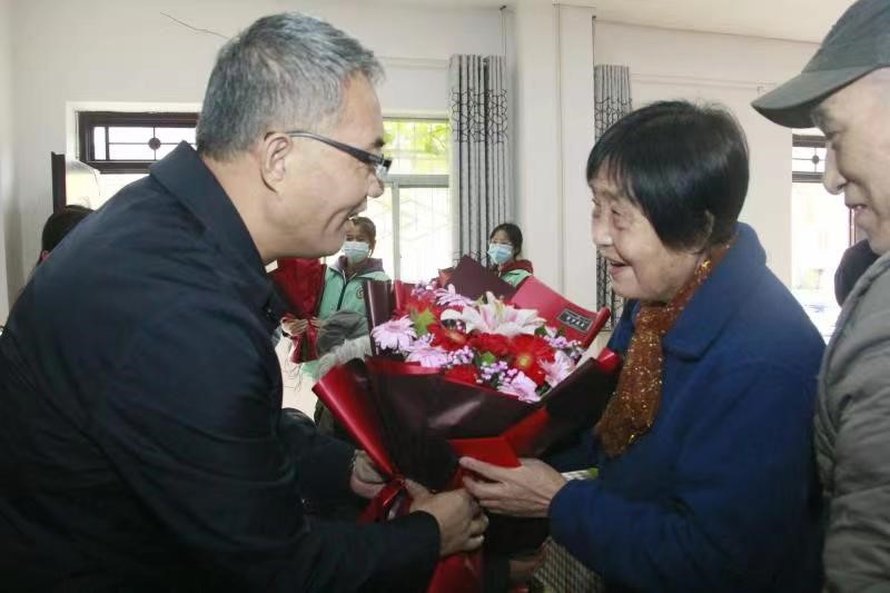 在全体人员的生日祝福歌中,赵健、杨子元代表学校为老同志送上生日贺礼和鲜花,与老同志共同分享生日蛋糕、合影留念。
