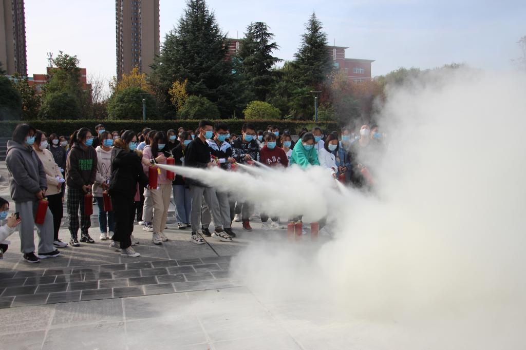 演练的第二项内容由维保公司人员为参演师生讲解了灭火器的使用方法和注意事项,学生在保卫处工作人员的指导下使用灭火器扑救现场明火,学习和掌握灭火器的使用方法。
