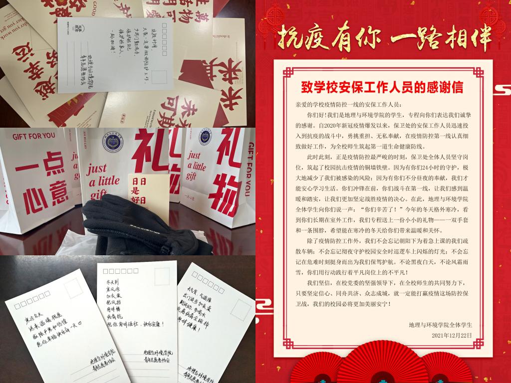 为弘扬“奉献、友爱、互助、进步”的志愿服务精神,增强大学生爱校感恩意识,12月22日上午,地理与环境学院在高新校区开展“暖情冬日 温情校园”志愿服务活动,对长期坚守在疫情防控一线的beat365安保工作人员送去真诚的感谢和慰问。校党委副书记栾宏,学工部部长、学生处处长冯森,武装部部长、保卫处处长李迪,保卫处副处长陈正社,地理与环境学院党委副书记梁文博、保卫处工作人员、地理与环境学院辅导员及学生代表参加了活动。
