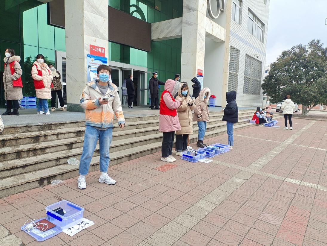 12月25日、26日清晨,雪花纷飞,寒风凛冽,冬日严寒挡不住志愿者汹涌的热情。两个校区的志愿者按照岗位分工分别于6:30、7:00进入工作岗位,开始了紧张忙碌志愿服务工作。在入校检测岗位,10余个检测通道的90余名志愿者身着防护服,用心、用情守护考生、守护着我们的家园。在交通指引岗位,志愿者坚守在各个路口,志愿者耐心细致地指导考生分流到指定区域,为考生架起了爱的“指南针”。在手机收纳岗位,志愿者按照考场分好了整理盒,一张张填好姓名和手机号的便利贴贴在手机上,让考生的手机得到妥善保管,为考生提供爱心服务。在书包存放岗位,志愿者用十几顶帐篷搭起了爱心防护,几千个书包整齐的躺在铺好防水布的帐篷下,没有受到寒雪的侵扰,考生们为之感动。在考场安全检查岗位,志愿者严格工作流程,逐项检查,不留死角,搭建起了安全防线。在机动岗位,志愿者随时待命,紧急处理物资调配、转运等工作任务。在新媒体岗位,志愿者发抖的双手依然拍摄出令人感动的画面。