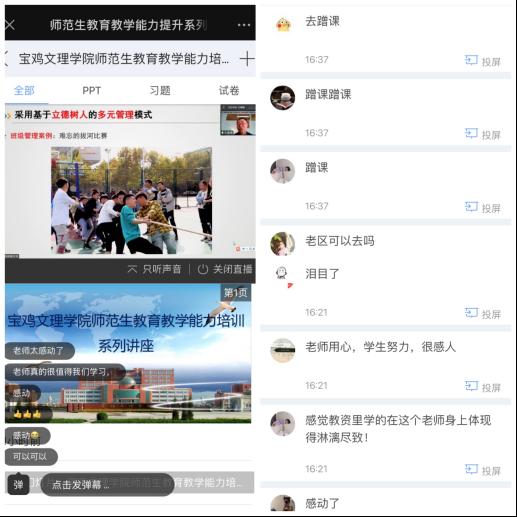 专家们围绕“教学计划与实施、班级管理与学生指导、基础教育改革与发展、教师职业道德修养”等主题做了具体的讲解。讲座由各师范专业学院教学副院长主持,通过“雨课堂”网络平台,专家们还对学生提问进行了答复,互动良好。系列讲座紧跟基础教育最新动态,内涵丰富,案例生动、引人深思,受到了同学们的热烈欢迎。