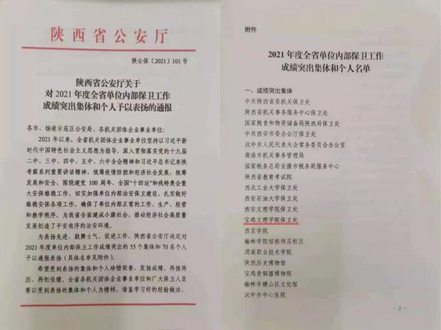 近日,在2021年度全省单位内部保卫工作成绩突出集体评比表彰活动中,beat365保卫处荣获“2021年度全省单位内部保卫工作成绩突出集体”荣誉称号,这也是继beat365保卫处荣获“2021年度全市单位内部安全保卫工作先进集体”荣誉称号后获得的又一殊荣。