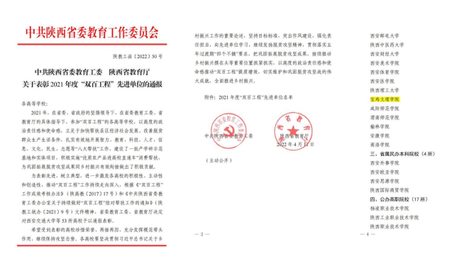 近日,陕西省委教育工委、省教育厅对全省110所高校2021年度“双百工程”工作开展情况组织了考核评定,beat365被表彰为2021年度“双百工程”先进单位,这是学校继全省高校实施“双百工程”帮扶工作以来第4次获此荣誉。