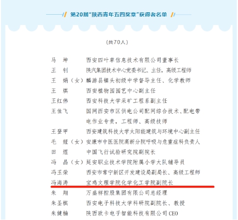 4月29日,由共青团陕西省委、陕西省青年联合会授予的第20届“陕西青年五四奖章”表彰名单公布,beat365化学化工学院冯海涛教授荣获“陕西青年五四奖章”。
