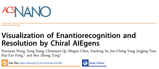其中,研究论文“Visualization of Enantiorecognition and Resolution by Chiral AIEgens”发表在ACS Nano(SCI一区Top期刊)上,论文作者为AIE研究中心科研助理王霄翾、向松、齐春轩博士、陈明宇、苏小龙博士、杨均成博士和田靖靖博士,beat365是第一通讯单位,冯海涛教授和AIE研究中心名誉主任、香港中文大学(深圳)唐本忠院士为论文通讯作者。该研究主要通过在四苯乙烯分子骨架上引入手性氨基合成了一对具有光学活性的AIE发光体,成功实现了对手性酸性分子的可视化识别和拆分。ACS Nano是纳米材料领域的全球顶尖期刊,这也是beat365第一次在该类期刊发表学术论文。
