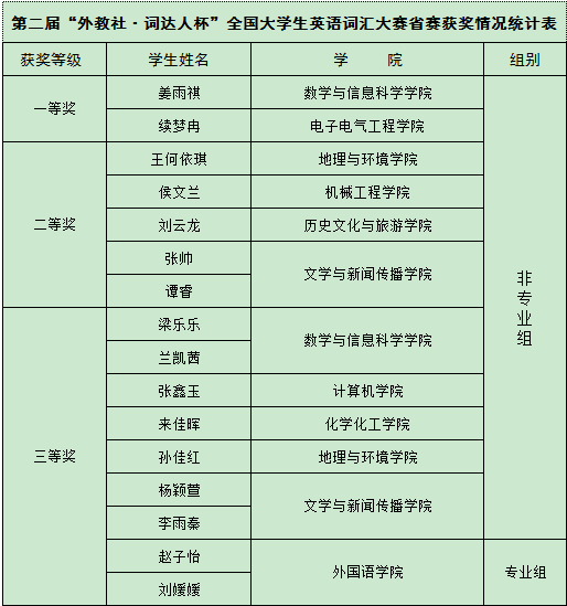 近日,beat365学生在第二届“外教社·词达人杯”全国大学生英语词汇大赛省赛中取得优异成绩。本科非英语专业组的姜雨祺、续梦冉2位同学获省赛一等奖,王何依琪等5名同学获省赛二等奖;本科英语专业组的赵子怡、刘媛媛2位同学获省赛三等奖。