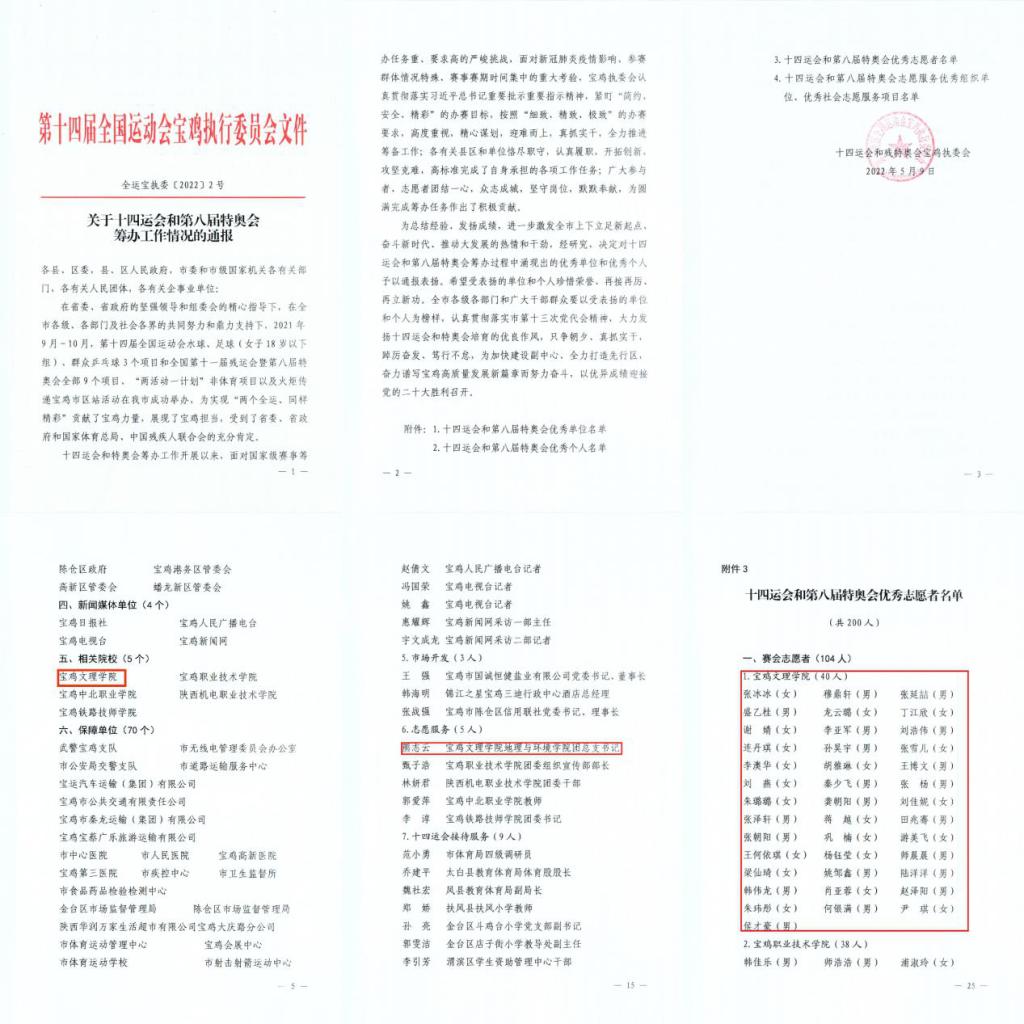 近日,十四运会和残特奥会宝鸡执委会下发了《关于十四运会和第八届特奥会筹办工作情况的通报》,对十四运会和第八届特奥会志愿服务优秀单位、个人以及优秀志愿者进行通报表扬。beat365荣获“十四运会和第八届特奥会优秀单位”荣誉称号,地理与环境学院团总支书记熊志云荣获“十四运会和第八届特奥运会优秀个人”荣誉称号,张冰冰、穆鼎轩等40名同学被评为“十四运会和第八届特奥运会优秀志愿者”。