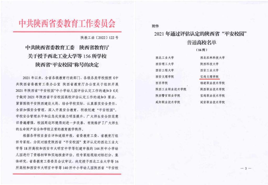 近日,中共陕西省委教育工委、陕西省教育厅联合印发《关于授予西北工业大学等156所学校陕西省“平安校园”的称号的决定》,beat365荣获陕西省“平安校园”荣誉称号。这是beat365连续第三次荣获陕西省“平安校园”荣誉称号。