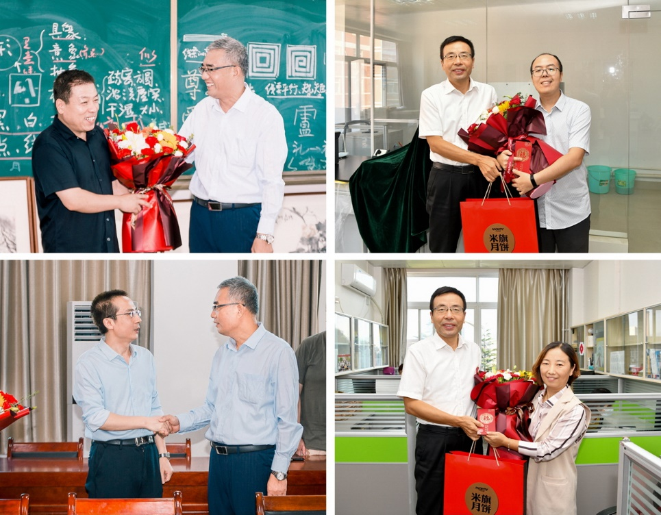 赵健、郭霄鹏向老师们送上鲜花并与他们亲切交流,询问他们的教学、科研、学习、生活等情况,听取他们对学校发展的意见和建议,感谢他们为学校发展作出的努力和贡献。