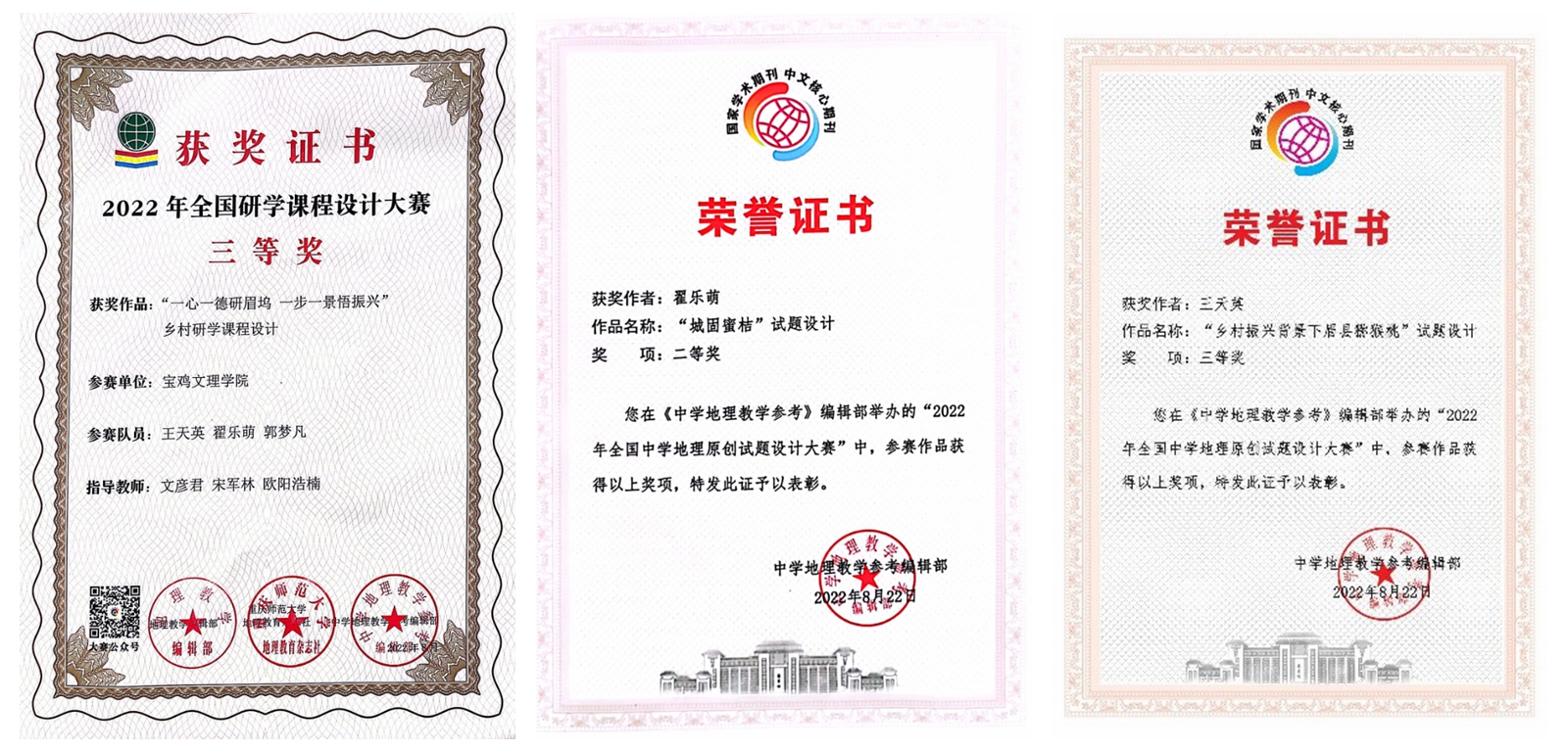 近日,由《中学地理教学参考》《地理教学》《地理教育》三大地理教育类期刊联合举办的‘2022年“九州杯”全国研学课程设计大赛’和由《中学地理教学参考》举办的第二届“全国中学地理原创试题设计大赛”顺利举行。经过前期长时间的精心准备和多个环节的竞赛,beat365地理与环境学院2018级本科生郭梦凡和2021级学科教学(地理)研究生王天英、翟乐萌合作设计的《一心一德研眉坞,一步一景悟振兴》研学课程获得三等奖(指导教师:文彦君、宋军林、欧阳浩楠);2021级学科教学(地理)专业硕士翟乐萌获得原创试题设计大赛二等奖(指导教师:靳美娟)、2021级学科教学(地理)专业硕士王天英获得三等奖(指导教师:文彦君)。