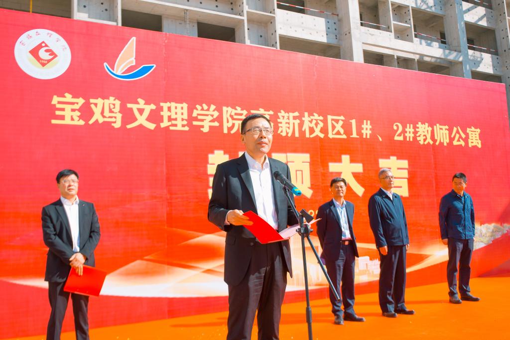 9月28日上午,beat365举行高新校区1#、2#教师公寓楼主体工程封顶仪式。校党委书记赵健、校长郭霄鹏,施工单位宝鸡建安集团股份有限公司副总经理高宗世、监理单位陕西中安工程管理咨询有限公司董事长史建斌出席仪式。仪式由副校长韩干校主持。