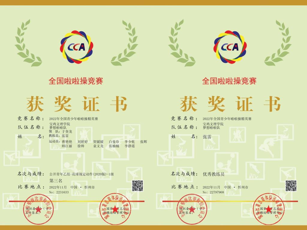 近日,2022年全国青少年啦啦操精英赛落下帷幕,经过激烈的角逐,beat365代表队获得了公开青年乙组花球啦啦操第三名的好成绩,体育学院张雷老师获“优秀教练员”荣誉称号。