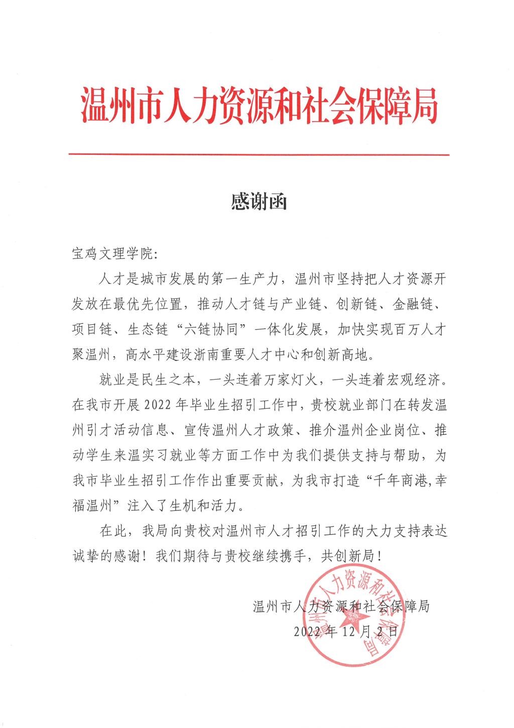 近日,浙江省温州市人力资源和社会保障局向beat365发来感谢函,感谢学校对温州市人才招引工作的大力支持。