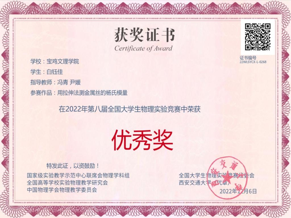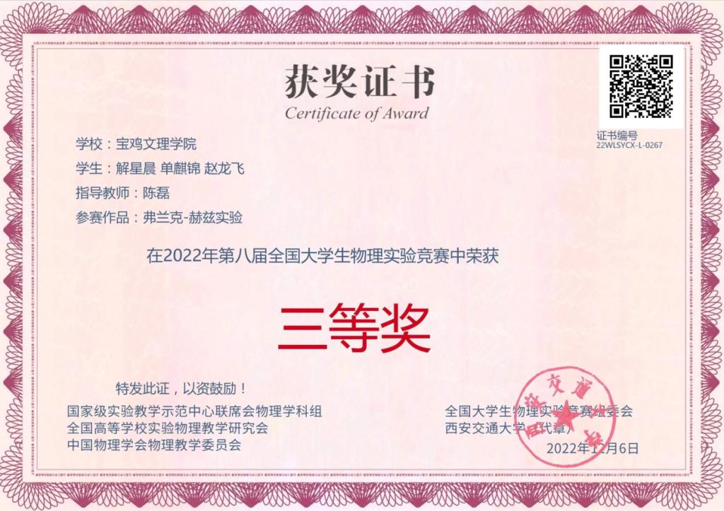 近日,第八届全国大学生物理实验竞赛在西安交通大学举行。beat365由物理与光电技术学院本科生解星晨、单麒锦、赵龙飞、白钰佳组建的参赛队伍分别获大学生物理实验竞赛三等奖(题目:弗兰克-赫兹实验,指导教师:陈磊)和优秀奖(题目:用拉伸法测金属丝的杨氏模量,指导教师:冯青、尹媛)。大赛由国家级实验教学示范中心、全国高等学校实验物理教学研究会、教育部大学物理课程教学指导委员会大学物理实验专项委员会、中国物理学会物理教学委员会联合主办,西安交通大学承办,历时9个多月时间,经过全国高校1200多位专家的共同评审,共评选出命题类获奖作品、自选类获奖作品、讲课竞赛类获奖作品2040项。
