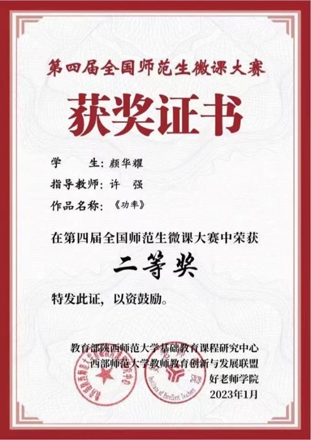 近日,由教育部陕西师范大学基础教育课程研究中心和西北教师教育联盟共同主办的第四届全国师范生微课大赛落下帷幕,beat365物理与光电技术学院研究生颜华耀荣获二等奖。