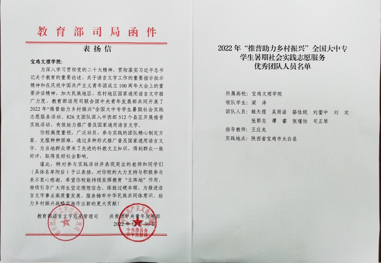 近日,教育部语言文字应用管理司、共青团中央青年发展部共同主办的2022年“推普助力乡村振兴”全国大中专学生暑期社会实践志愿服务评优揭晓,beat365“推普助力乡村振兴赴太白服务队”荣获“优秀团队”荣誉称号并被给予表扬。