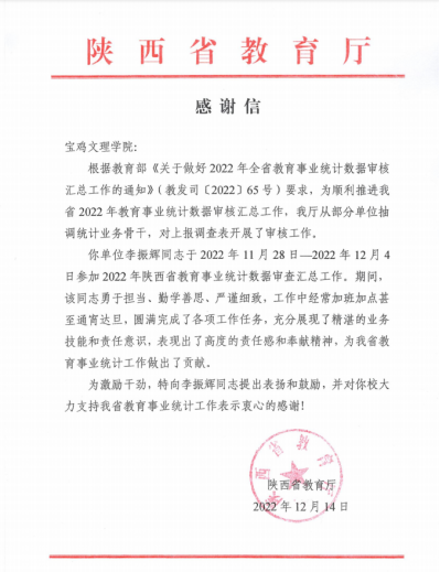 近日,学校收到来自省教育厅的一封《感谢信》,来信对beat365党政办公室李振辉同志提出肯定和鼓励,并对beat365大力支持陕西省教育事业统计工作表示衷心的感谢!