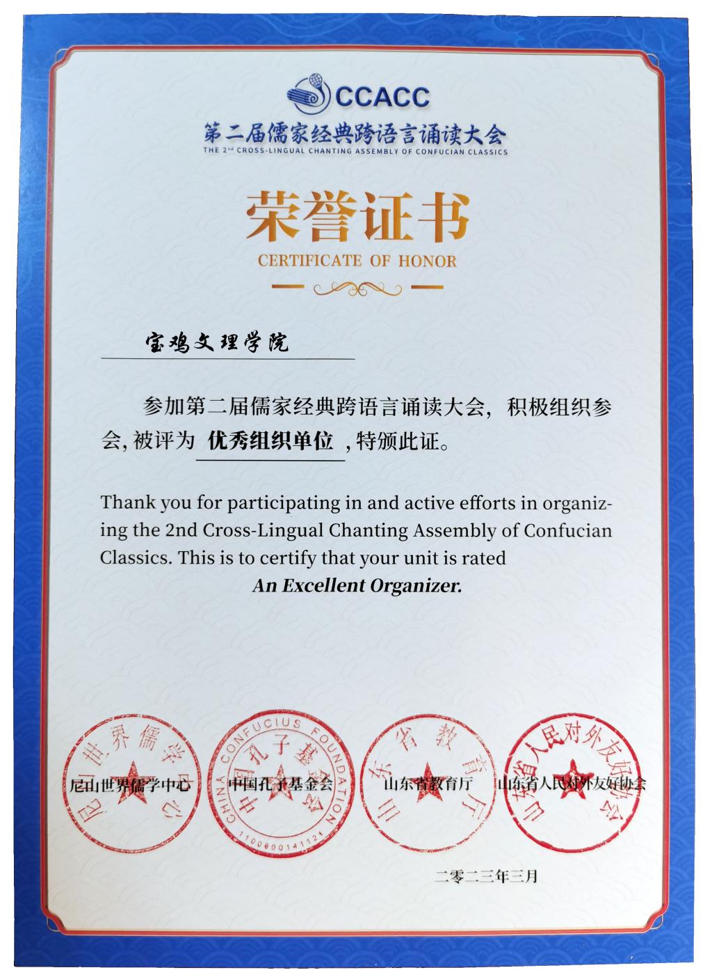 3月25日,由尼山世界儒学中心、中国孔子基金会、山东省教育厅、山东省人民对外友好协会主办,中国孔子网融媒体、山东省翻译协会、齐鲁理工学院承办的第二届儒学经典跨语言诵读大会年度盛典在山东济南举办,大会以弘扬以孔子为代表的中华优秀传统文化,增进中外文明交流借鉴,讲好中国故事,传播中国声音为主题,是一场国际性的文化交流盛事。大会得到文化和旅游部国际交流与合作局的批复,获得教育部中外语言交流合作中心、中国翻译协会的大力支持,以及贝尔格莱德中国文化中心、德国孔子学堂、韩国安东大学孔子学院、韩国孔子文化中心、印尼大道文化研究中心等海外组织的积极响应。