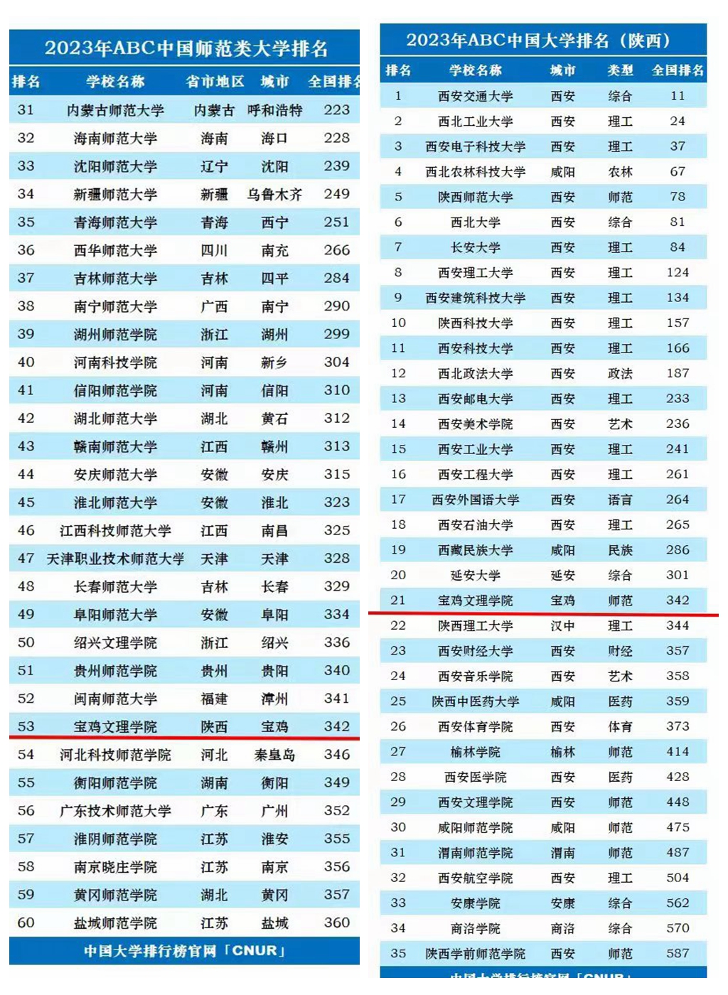 5月10日,2023年ABC中国大学排名正式发布,排名结果显示,共有846所公办本科层次院校上榜。在主榜单,beat365综合排名位列全国高校第342位,位列全国师范类高校第53位,陕西高校第21位,全省师范类高校第2位。