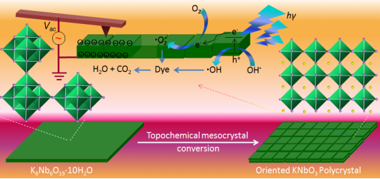 具有钙钛矿结构的KNbO3是无铅压电材料的杰出代表,其二维取向多晶在压电、催化、能量储存与转换等领域具有广阔的应用前景。然而,由于其高纵横比和择优取向性,二维KNbO3取向多晶难以制备。本研究以乙二醇-水为反应媒介,巧妙调配反应体系极性和粘性控制晶体成核速率,使用溶剂热法定向溶解沉积可控制备二维铌酸盐前驱体;再基于拓扑化学介观转变机制,采用煅烧方式处理二维铌酸盐前驱体,制备出具有[110]晶轴的二维KNbO3取向多晶。该二维KNbO3取向多晶由于高度取向,不仅表现出单晶性质,还具有取向纳米晶体的集体内增效应,因而呈现出优异的压电性能和光催化性能。该成果不但进一步补充和发展了拓扑化学介观转变机制理论,还为溶剂热法开发二维取向材料及其在压电和光催化领域的有效应用提供了新策略。(科研管理处、化学化工学院 文、图/周妮妮 审核/王晓玲、胡登卫)