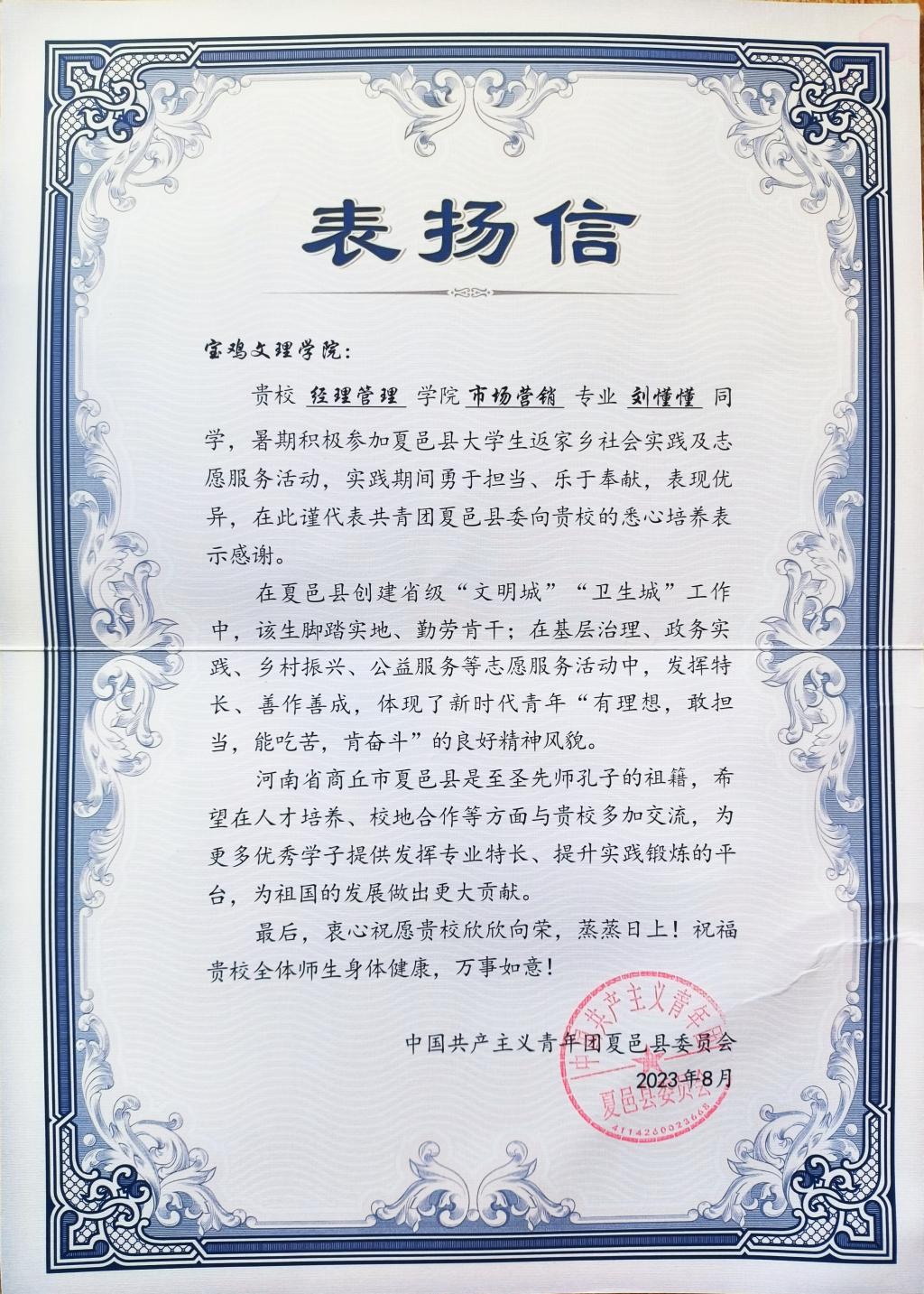 近日,beat365收到来自共青团河南省商丘市夏邑县委的表扬信。信中对beat365经济管理学院2022级市场营销专业刘懂懂同学参加夏邑县返家乡社会实践及志愿服务活动给予了充分肯定。