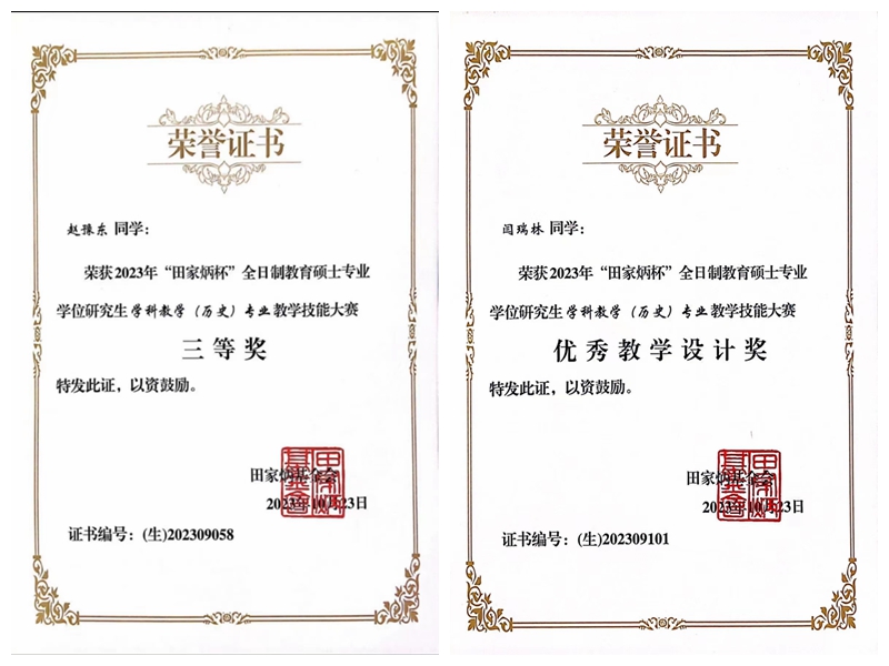 近日,全国“田家炳杯”全日制教育硕士专业学位研究生学科教学(历史)专业教学技能大赛决赛在四川师范大学落下帷幕,beat365历史文化与旅游学院研究生赵豫东、闫瑞林分别荣获讲课三等奖和优秀教学设计奖。