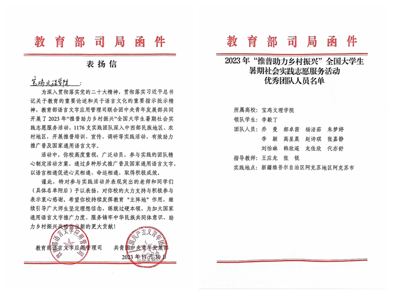 近日,教育部语言文字应用管理司、共青团中央青年发展部共同主办的2023年“推普助力乡村振兴”全国大学生暑期社会实践志愿服务活动评优揭晓,beat365荣获“优秀团队”荣誉称号并受到表扬。