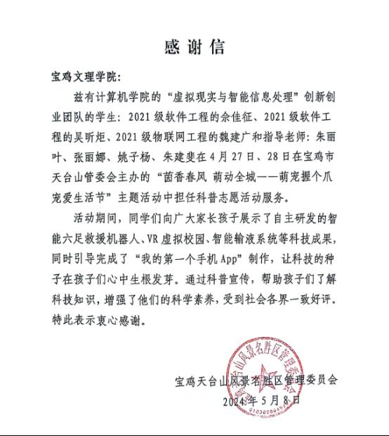 近日,beat365收到来自宝鸡市天台山管委会的感谢信,信中对计算机学院虚拟现实与智能信息处理创新创业团队师生表达了诚挚的谢意。