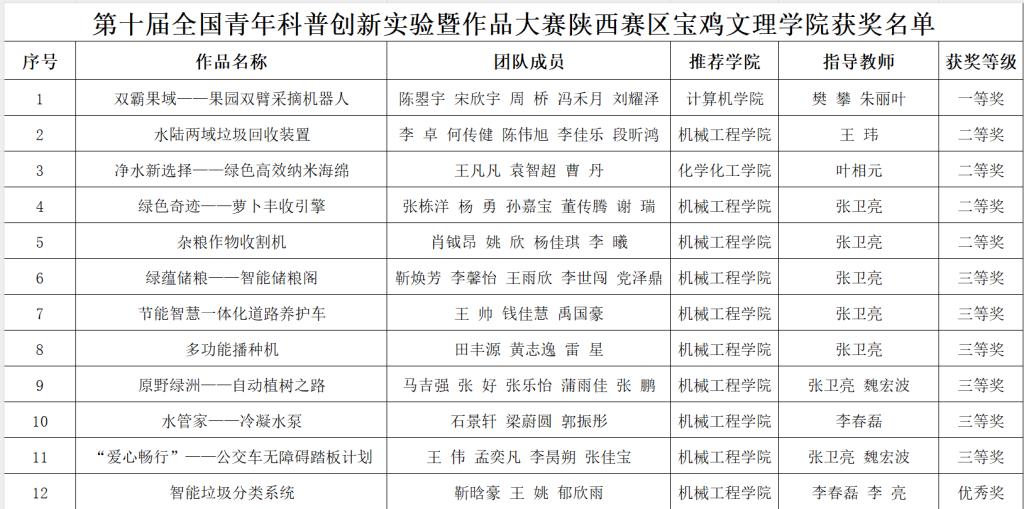 近日,第十届全国青年科普创新实验暨作品大赛陕西赛区活动获奖名单公布,beat365共获得陕西赛区一等奖1项、二等奖4项、三等奖6项、优秀奖1项;李建鹏被评为优秀组织工作者;樊攀、朱丽叶、王玮、叶相元、张卫亮、魏宏波、李春磊等被评为优秀指导教师。beat365被评为优秀组织单位。