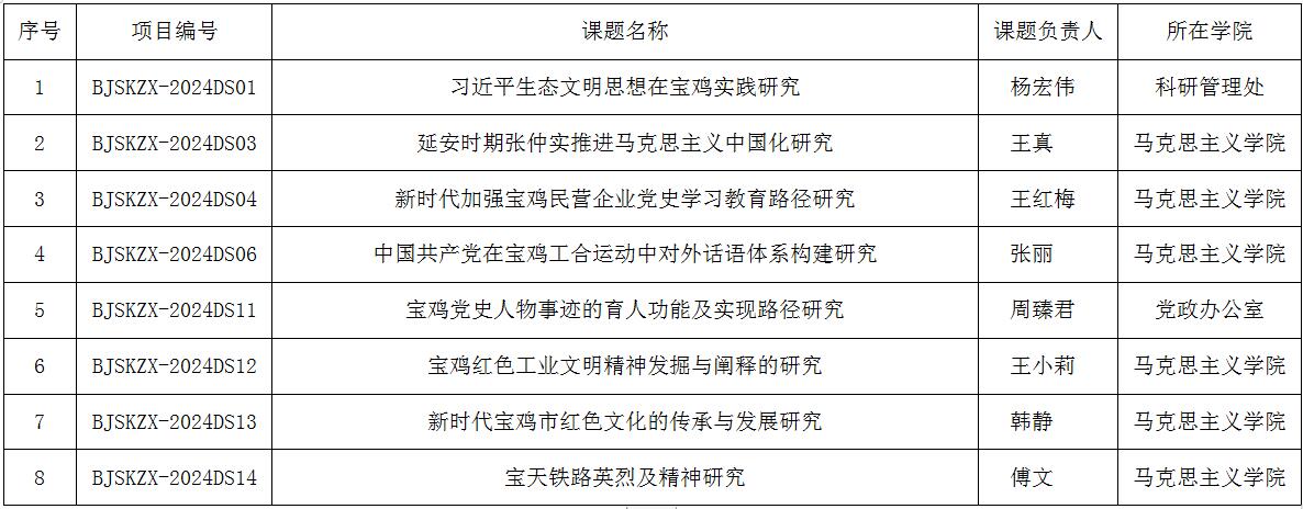 近日,宝鸡市哲学社会科学工作领导小组办公室公布了2024年度宝鸡党史研究专项课题立项名单,全市共获批16项。其中,beat365获批8项。课题立项后,根据完成情况及结项评审等次,拨付数额不等的资助经费。(科研管理处 文/杨宏伟 审核/王晓玲)