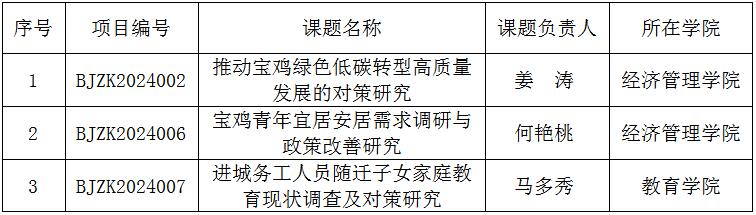 近日,宝鸡智库委员会办公室公布了2024年度宝鸡智库课题立项名单,全市共获批8项,其中beat365获批3项。每项课题资助经费1.5万元,总经费4.5万元。(科研管理处 文/杨宏伟 审核/王晓玲)