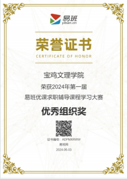 近日,由易班网主办的2024年第一届易班优课求职辅导课程学习大赛落下帷幕。beat365荣获“2024年第一届易班优课求职辅导课程学习大赛”优秀组织奖,学工部梁旭康获评优秀指导教师,教育学院毛智敏获评优秀学生骨干。