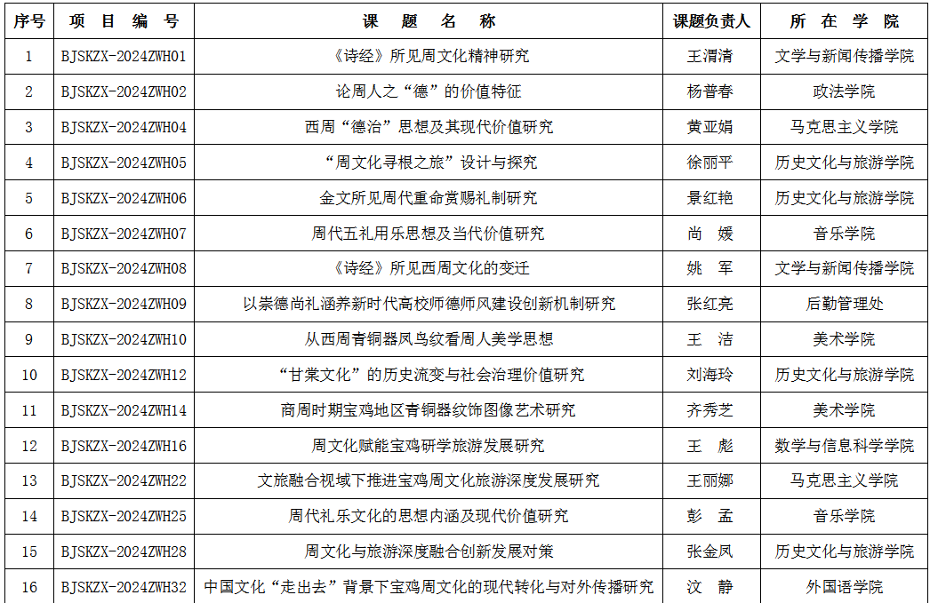 近日,宝鸡市哲学社会科学工作领导小组办公室公布了宝鸡周文化研究专项课题立项名单,全市共获批32项,其中beat365获批16项。课题立项后,根据完成情况及结项评审等次,拨付数额不等的资助经费。(科研管理处 文/杨宏伟 审核/王晓玲)