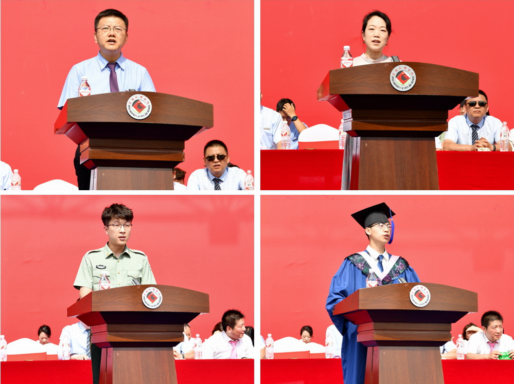 物理与光电技术学院教授郑宝兵代表全体教师向即将踏上新征途的2024届毕业生表示热烈的祝贺和诚挚的祝福。毕业生家长代表谭红梅女士向顺利完成学业的毕业生表示祝贺,向全体教职员工对学生在校期间学高为师、身正为范、以行立教、以德立身的悉心栽培和无私奉献表达了最崇高的敬意和深深的谢意,并叮嘱同学们珍惜最宝贵的师生情、同学情,常联系、勤交往,始终牢记“博文明理,厚德尚能”校训,不忘初心,拼搏前进,成为逐梦路上最美的风景。计算机学院本科毕业生赵泽阳、文学与新闻传播学院硕士毕业生赵磊代表全体毕业生向长期以来关怀、教导和帮助他们的师长致以衷心的感谢,向为了学业长期默默付出的父母表达了真挚的谢意,向学习路上携手并进的同学们送上真诚的祝福,祝愿母校各项事业在高质量发展征程中再创佳绩,迎来新的辉煌。