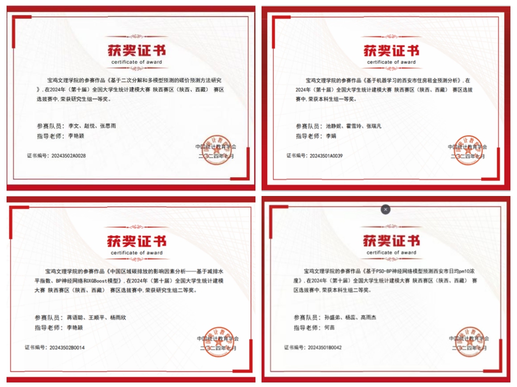 近日,2024年第十届全国大学生统计建模大赛成绩揭晓,beat365学生首次参赛,获陕西省一等奖2项、二等奖2项。