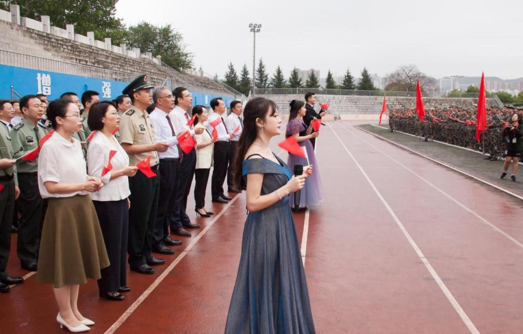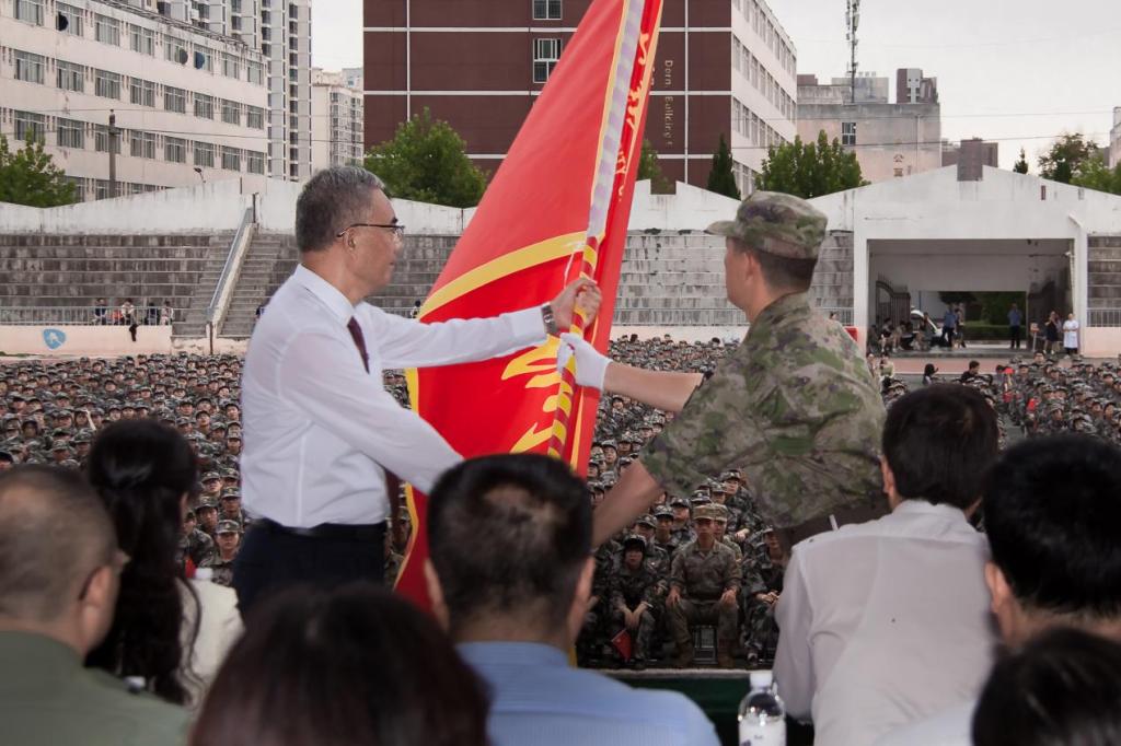 在雄壮的国歌声中开学典礼拉开序幕。校党委书记赵健为军训团授旗。