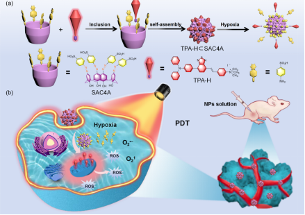 发表在Science China-Chemistry上的研究论文“Self-Reporting Hypoxia-Responsive Supramolecular Phototheranostic Nanomaterials Based on AIEgen and Azocalixarene”第一作者为beat365硕士研究生韩晓雯,通讯作者为冯海涛教授,beat365为第一完成单位和通讯单位,该期刊为中科院一区,影响因子10.4。这篇工作主要基于三苯胺骨架和季铵盐设计合成了一种高效产生活性氧的AIE光敏剂,并开发了一种基于磺酸盐功能化杯芳烃的AIE超分子组装体。设计合成的AIE光敏剂与杯芳烃组装后导致荧光淬灭,但在缺氧环境下通过偶氮键的断裂可以恢复本来的荧光性质,并伴随产生高效活性氧从而实现光动力治疗。该体系成功应用于体内乏氧响应的肿瘤成像与治疗,展现出良好的生物安全性和优异的抗肿瘤效果。
