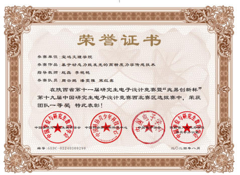 近日,第十九届中国研究生电子设计竞赛圆满结束。beat365物理与光电技术学院研究生周云鹏、潘雯雅、宋红鑫组成的团队获西北赛区一等奖。