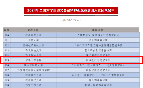近日,团中央青年志愿者行动指导中心等部门联合发布了《2024年全国大学生遵义会议精神志愿宣讲团入选团队名单》,beat365文学与新闻传播学院红城毅行志愿宣讲团成功入选。