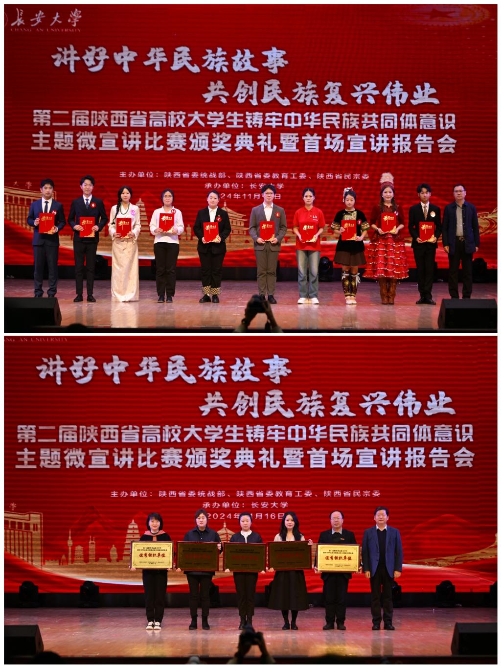 11月16日,由中共陕西省委统战部、陕西省委教育工委、陕西省民族宗教事务委员会联合主办的第二届“陕西省高校大学生铸牢中华民族共同体意识主题微宣讲决赛”在长安大学落幕。beat365文学与新闻传播学院2023级播音与主持艺术专业学生王晨宇、王浩安分别获得二等奖,并入选第二届陕西省高校大学生铸牢中华民族共同体意识宣讲团。beat365获优秀组织奖。
