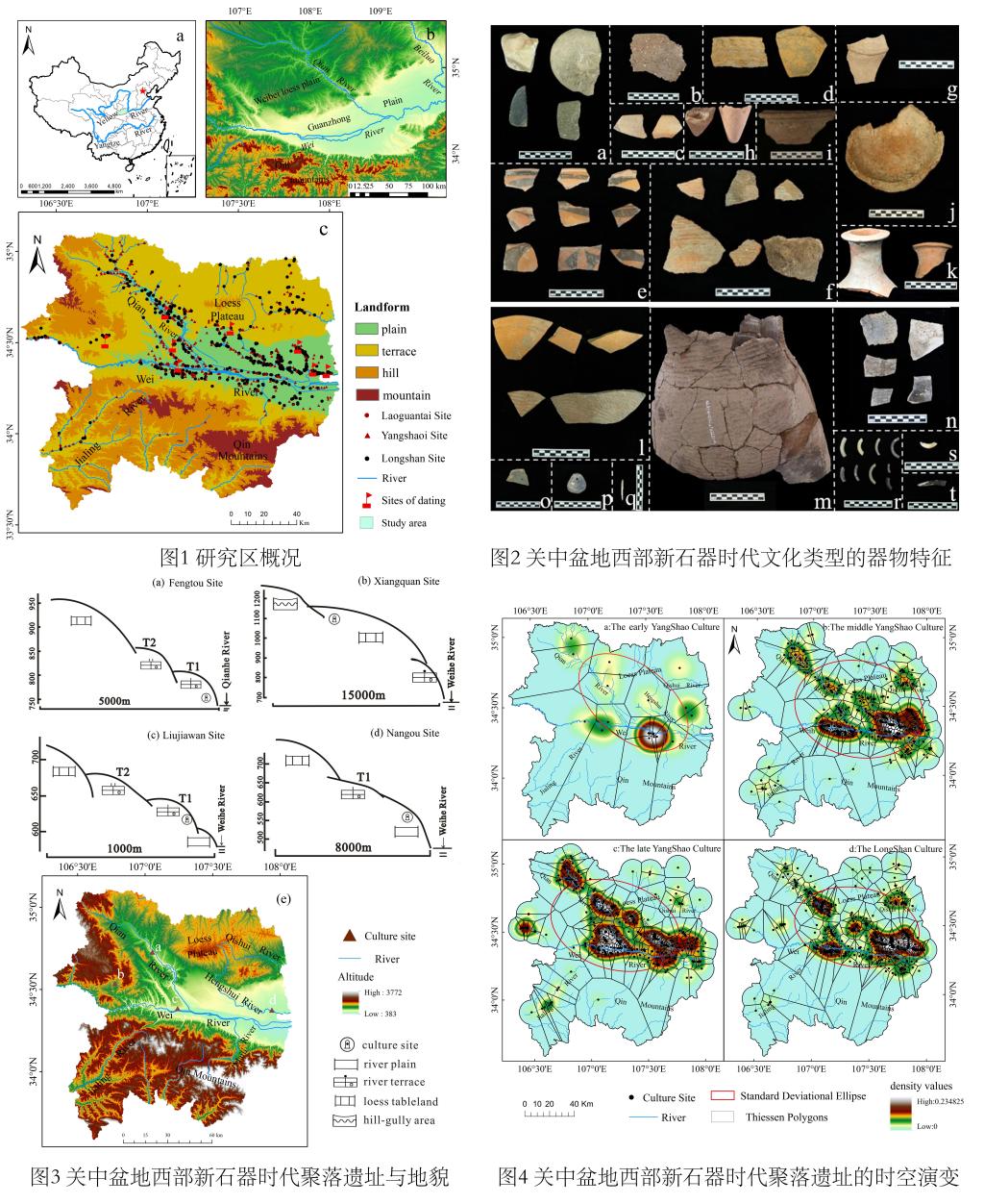 研究以考古文献资料和野外考察为基础,将测年技术、GIS分析和数学模型等方法相结合,地理学、考古学、环境学等多学科交叉,通过新石器时期的关中盆地西部883处遗址、结合采集到的上千件陶器残片以及各类古人类活动遗迹、遗物(图2),探讨关中盆地西部新石器时期聚落的时空分布特征及迁移规律,定量分析人类活动与自然地理要素的关系。结果表明:(1)关中盆地西部新石器时期包含老官台文化、仰韶文化和龙山文化三种文化类型,古人类活动的绝对年代在7,500-3,900aBP,表明关中盆地西部文化演化具有连续性;(2)聚落分布在地貌上趋向于河流阶地和黄土台地(图3),海拔在1050m以下地区,古人类活动在海拔上呈现“升高-降低-再次增高”的演变规律。聚落集中程度呈“倒V”变化,在空间上呈“中低北高”,随着新石器不同时期文化的演变,聚落与水系的关系表现为由近水转为远水分布,相比之下龙山时期则是远水生活。整个新石器时期古人类聚落选址在坡度上逐渐上升,由早期的15°上升到25°,坡向集中在朝南方向为主,但是没有特别明显的规律。活动中心由单核(渭河)扩散至多核(渭河、千河、漆水河)又转变为单核(渭河)的迁移规律(图4),最终在东南部现今的扶风-岐山一带成为龙山人类的聚集中心,这为周原文明在该区域的发展与强盛奠定了坚实的基础;(3)新石器时期关中盆地西部自然地理环境适宜性等级由渭河向南北两侧扩展逐渐降低,聚落主要分布在渭河两侧的高度适宜区和中度适宜区,综合分析发现气候在关中盆地西部新石器时期人口迁移中占据主导地位,而生产生活方式决定了人类在区域中的活动范围;(4)结合中原和甘青地区研究发现,早在新石器时期人类已掌握了一定的自然规律,聚落在空间分布上体现出人类“规避灾害”“折中调和”的意识。