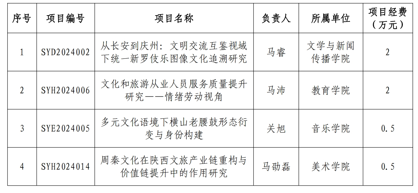 近日,陕西省艺术科学规划领导小组办公室公布了2024年度陕西省艺术科学规划项目立项名单,beat365共获批4项,总经费5万元。(科研管理处 文/张蕴 审核/王晓玲)