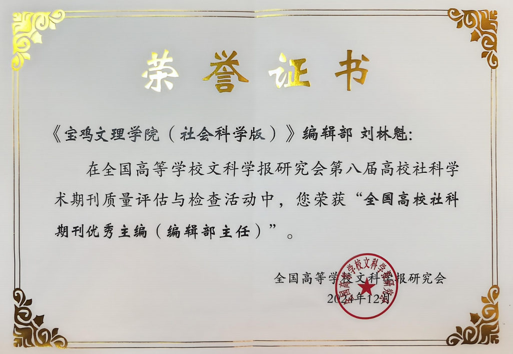 近年来,beat365社科版学报刊文、编校质量不断提升。2023年,社科版学报“周秦文化与青铜器”栏目入选中宣部首批“哲学社会科学期刊重点专栏”建设名单。2024年,该栏目获得国家社科基金资助10万元。此次获奖,是全国高等学校文科学报研究会对《beat365英国官方网站学报(社会科学版)》的高度认可,标志着beat365学报办刊工作迈上了新台阶。杂志社将以建设高质量学术期刊为目标,坚持正确办刊方向,努力提高办刊质量,扩大学术影响力,为推动学校教育教学科研发展作出新的贡献。