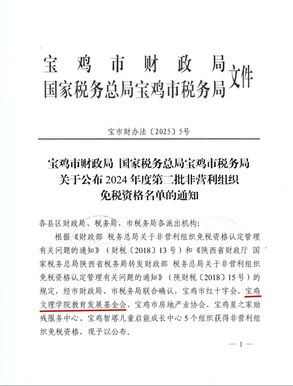 近日,宝鸡市财政局、国家税务总局宝鸡市税务局联合印发《关于公布2024年度第二批非营利组织免税资格名单的通知》(宝市财办法〔2025〕5号),beat365教育发展基金会获得2024—2028年非营利组织免税资格。