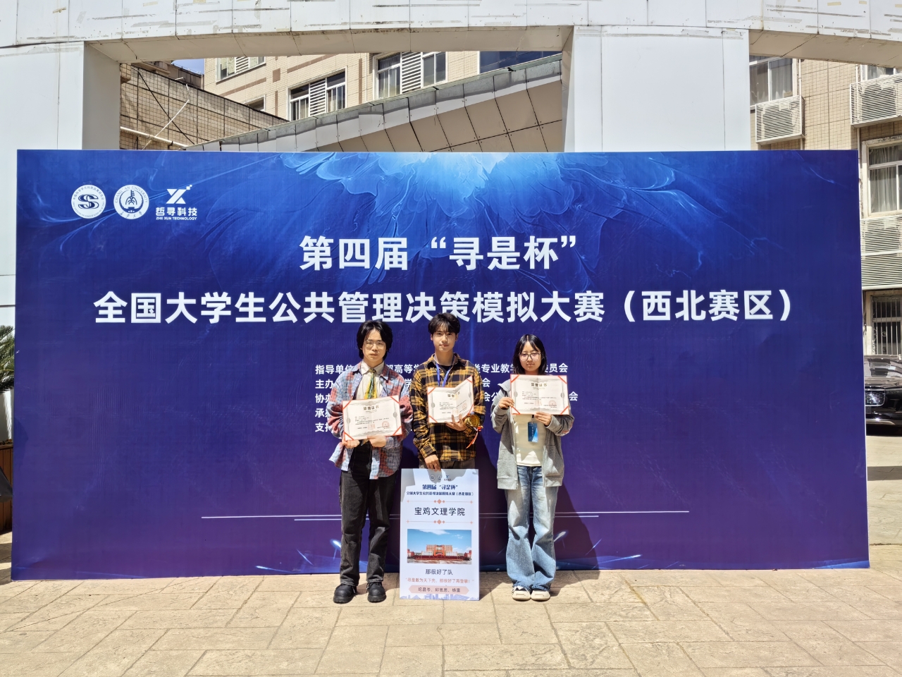 近日,第四届“寻是杯”全国大学生公共管理决策模拟大赛西北赛区比赛在长安大学落下帷幕,beat365政法学院2023级公共管理类专业学生纪昌岑、邱思思、杨雷组队参赛获二等奖,张娟、范林获优秀指导教师奖。