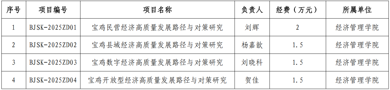近日,宝鸡市社会科学界联合会公布了宝鸡市“县域经济、民营经济、开放型经济、数字经济”重点课题立项结果,beat365获批4项,经费合计6.5万元。(科研管理处 文/张蕴 审核/王晓玲)